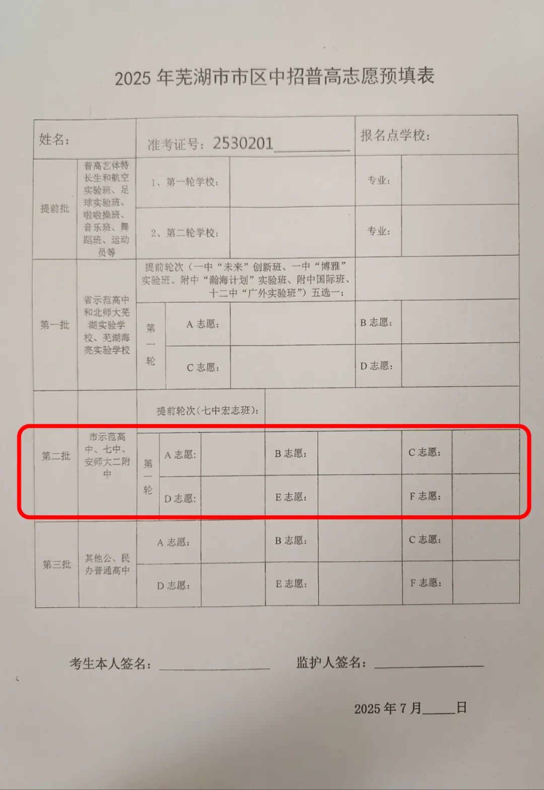 以《2025年芜湖市市区中招普高志愿预填表》为例,填写姓名、准考证号和报名点学校之后,选择第二批次填写英美精英班志愿代码111。