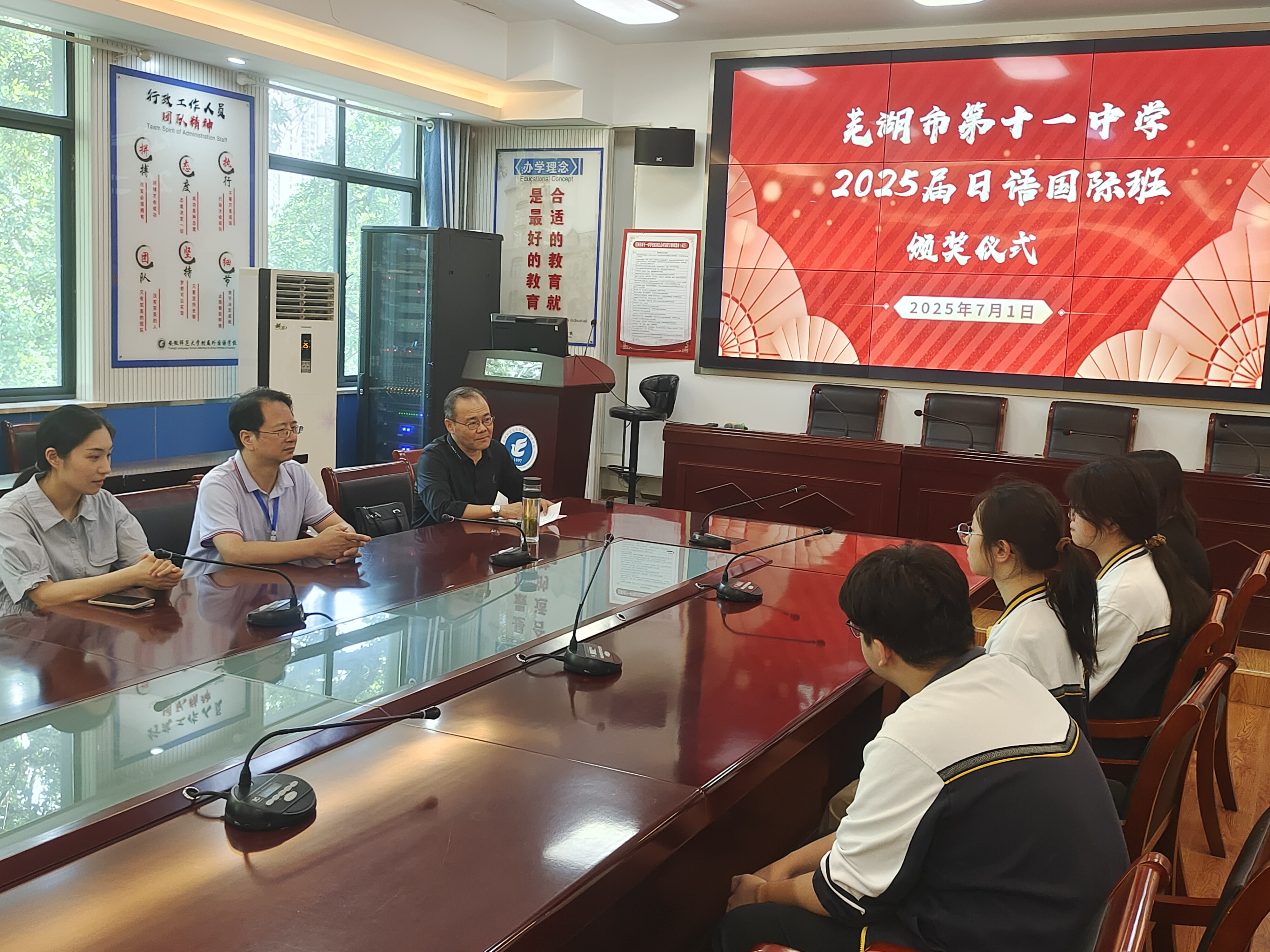 2025年7月1日,一场简单但温馨的颁奖仪式在芜湖市第十一中学举行。活动由安徽师范大学资产经营有限公司卡迪夫国际预科中心教学总监唐俊主持,十一中对外交流处主任陈瑞东、日语班班主任兼日语教师夏英琦和日语班学生齐聚一堂,共同见证这一荣耀时刻。