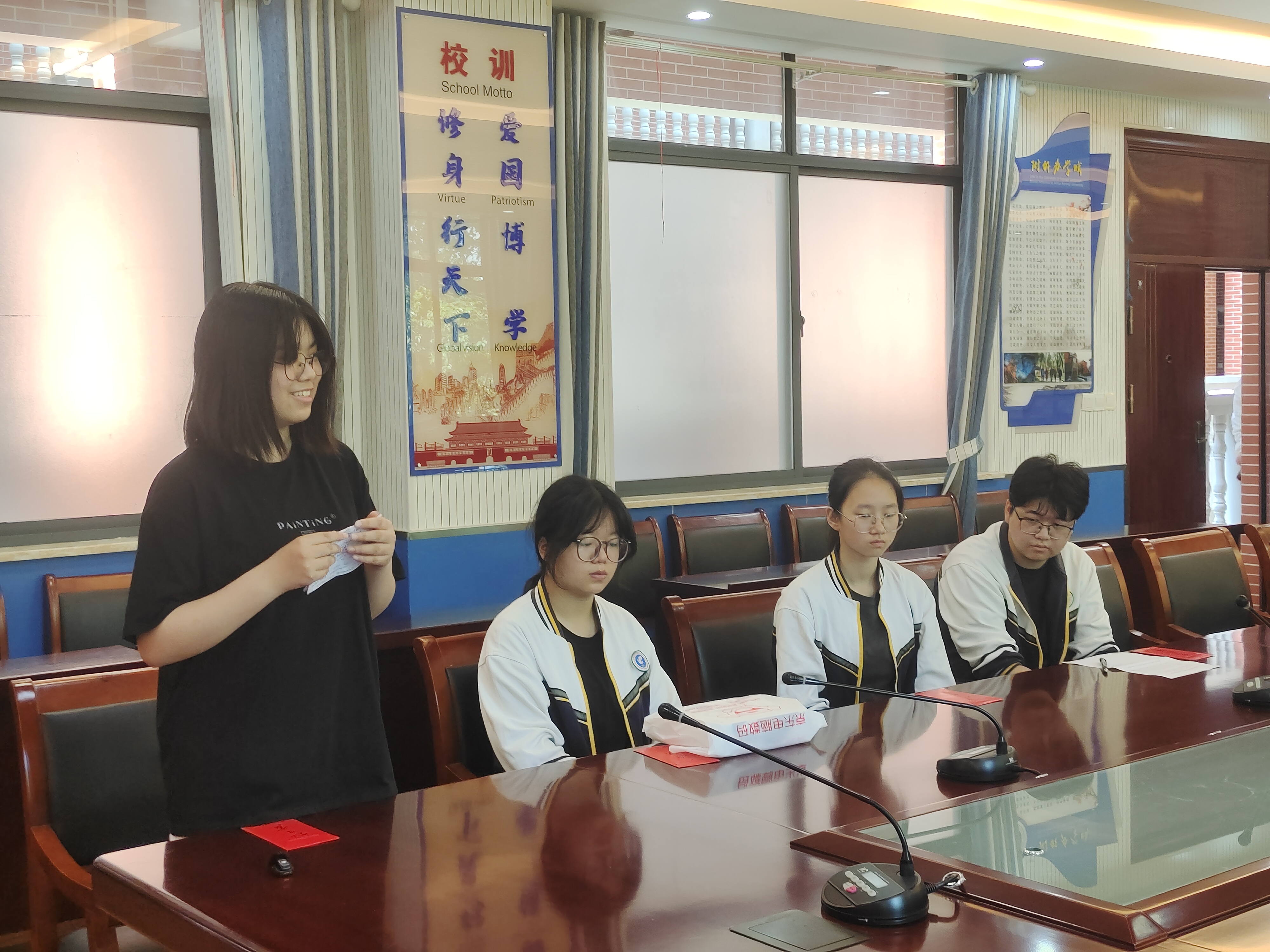 唐俊首先宣读奖励决定,表彰对象为在此次日语高考中表现优异的学生们。奖项设置分为一等奖和二等奖,一等奖获得者为孙宝宜,二等奖获得者是叶帆、许诺、倪凯瑞。这一奖励不仅是对学生们高考成绩的高度认可,更是对他们三年来努力学习的肯定。它象征着荣誉与鼓励,激励着更多学生在学习的道路上奋勇前行,为自己的梦想而努力拼搏。